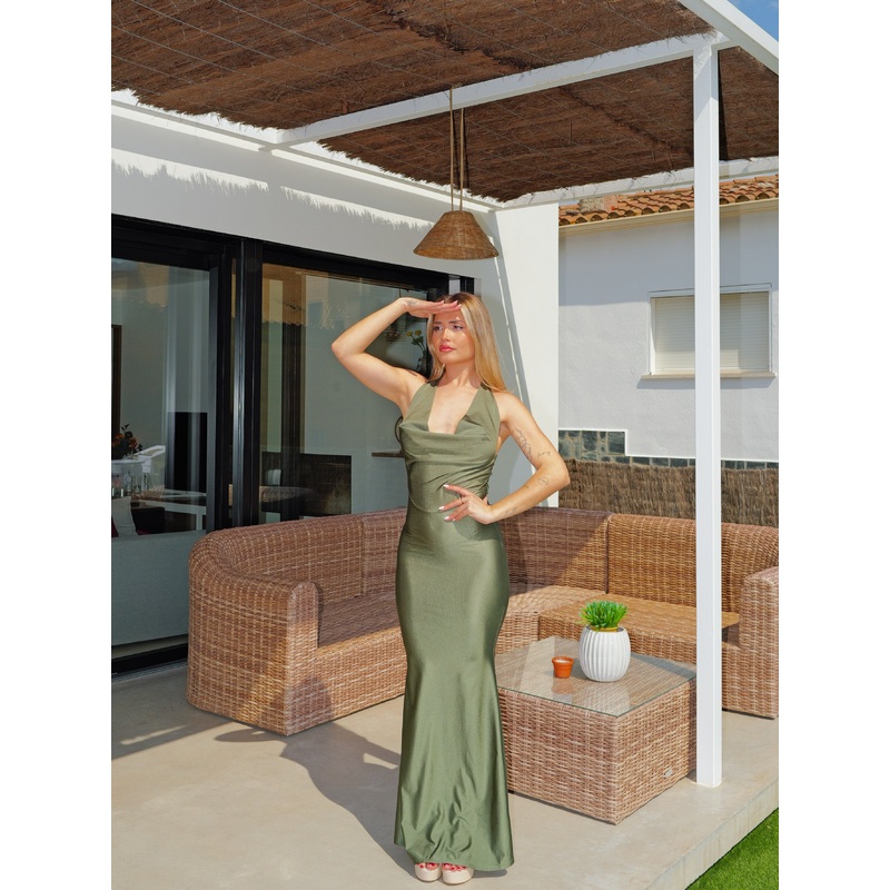 Vestido largo de escote cascada anudado al cuello.Espalda al aire y es elstico.Vestido largo para eventos, bodas y graduaciones.Talla nica (sirve de la 32 a la 38)Modelo: Altura 160 cm, Pecho 90 cm, Cintura 65 cm, Cadera 92cmCOMPOSICIN: 95% Polister y 5% E
