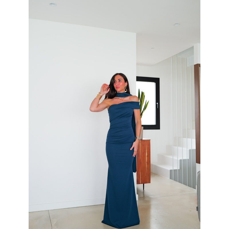 Vestido choker frunce asimtrico petrleo U(34-38)
