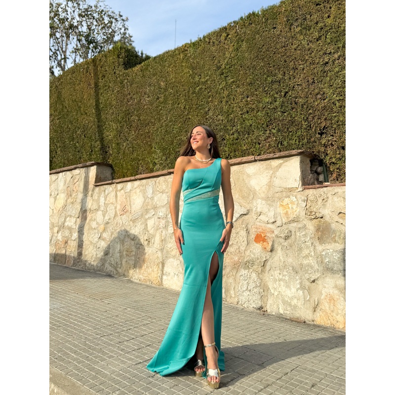 Vestido de escote asimtrico con detalle de pedrera en la cintura. Raja en la falda, lleva copas en el pecho y es elstico . Cierre con cremallera invisible.
