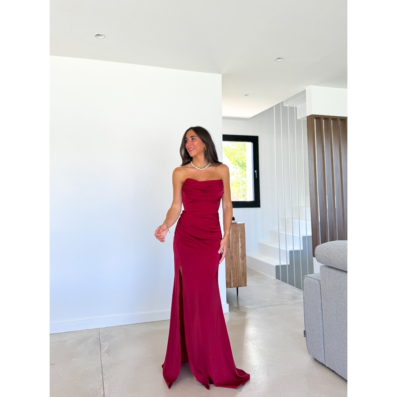Vestido largo de tejido raso, con escote palabra y diseo de bandas drapeadas. Lleva abertura en la falda y es ajustado Cierre con cremallera invisible.Vestido largo para graduaciones, bodas y eventos.Tallas disponibles: S(34/36), M (36/38) y L (38/40)Model