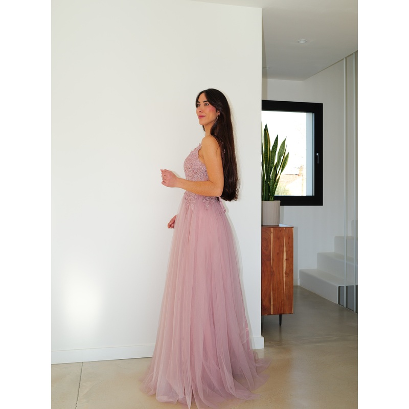 Vestido de escote pico con cuerpo corse en encaje y pedrera. Falda de tulle con abertura. Lleva copas en el pecho y el cierre es de cremallera invisible con entrelazado satinado en la espalda.Vestido largo para bodas, graduaciones y eventos.Tallas disponib
