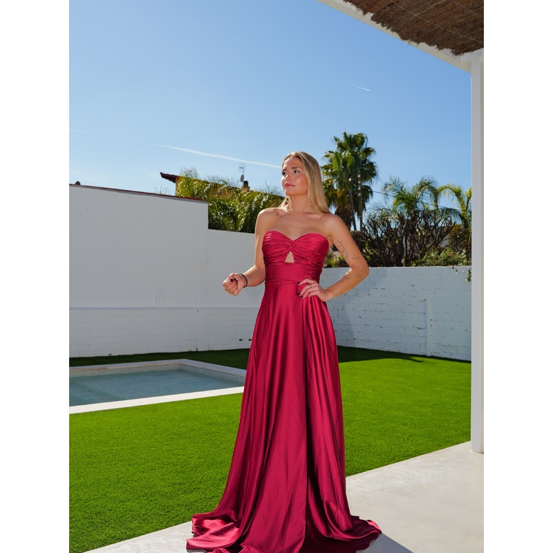 Vestido largo con escote corazn y nudo. Tiene escote y abdomen con detalle de fruncido y abertura. Tiene abertura en la pierna y abertura en la pierna.Vestido largo para graduaciones, bodas y eventos.Tallas S(34-36), M(38-40) y L(40-42)Modelo: Altura160 cm