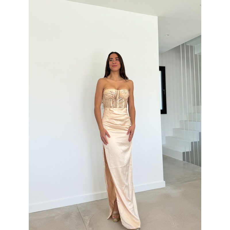 Vestido con corte princesa, abertura lateral y cuerpo de cors regulable con lazo. Tejido de raso con forro. Tiene copas en el pecho. Cors con pedrera.