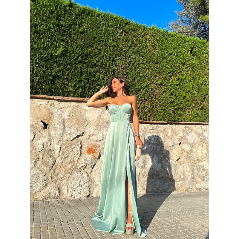 Vestido con corte princesa, abertura lateral y cuerpo de cors regulable con lazo. Tejido de raso con forro. Tiene copas en el pecho