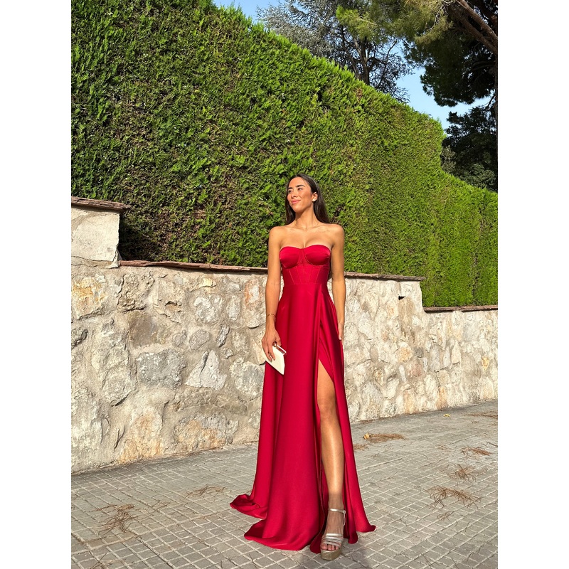 Vestido con corte princesa, abertura lateral y cuerpo de cors regulable con lazo. Tejido de raso con forro. Tiene copas en el pecho
