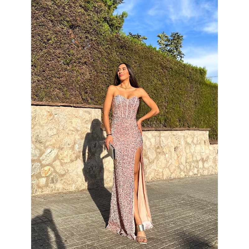 Vestido con cors sirena y cuerpo cors con detalle de lentenuelas y brillos. Lleva copas en el pecho y forro en la falda. Cierre con cremallera invisible y ajustable con lazada entrelazada en la espalda.Vestido largo para graduaciones, bodas y eventos.Talla
