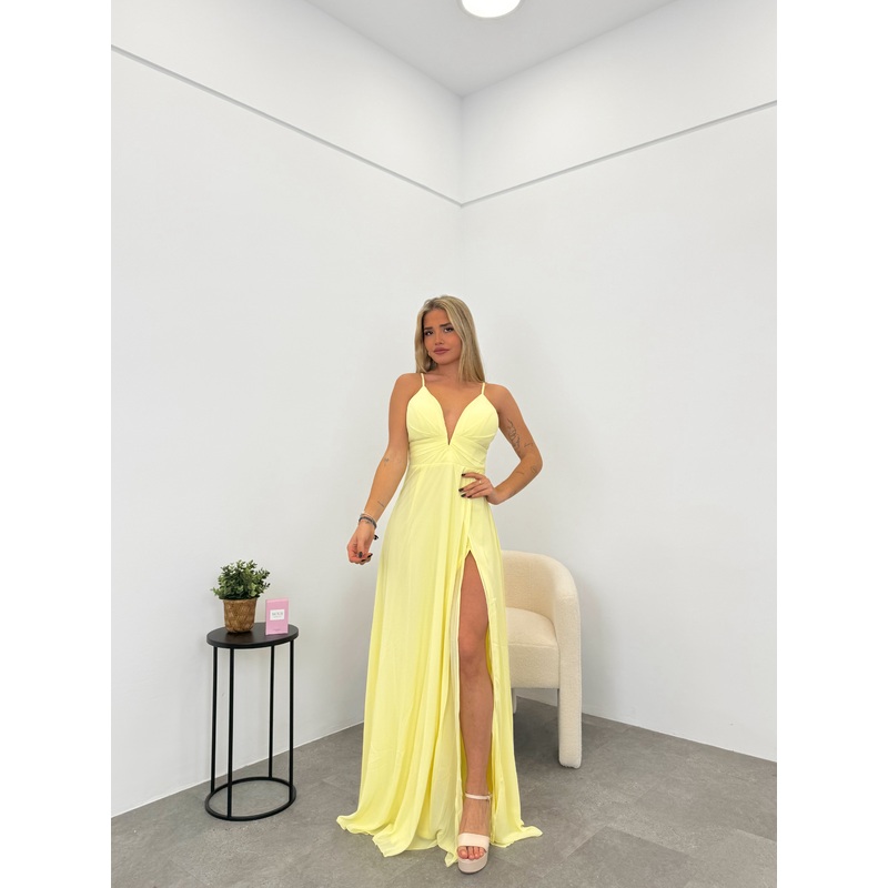 Vestido largo de tejido crepe, con escote pico y detalle de pliegues. Tirante fini regulable y lleva copas en el pecho.Detalle de abertura en la falda y cierre con cremallera invisible.
