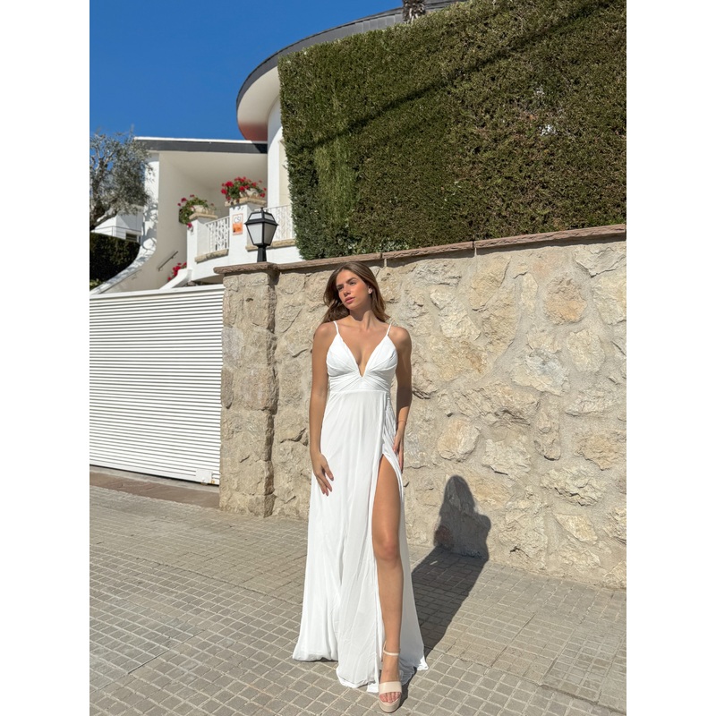 Vestido largo de tejido crepe, con escote pico y detalle de pliegues. Tirante fini regulable y lleva copas en el pecho.Detalle de abertura en la falda y cierre con cremallera invisible.Vestido largo para graduaciones, bodas y eventos.Tallas disponibles S(3