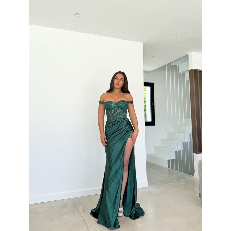 Vestido largo de tejido raso y escote palabra de honor, cuerpo tipo cors con ballenas detalle de manguitos en los brazos. Detalle de abertura en la falda en diseo drapeado. Cierre con cremallera invisibleVestido largo para graduaciones, bodas y eventos.Dis