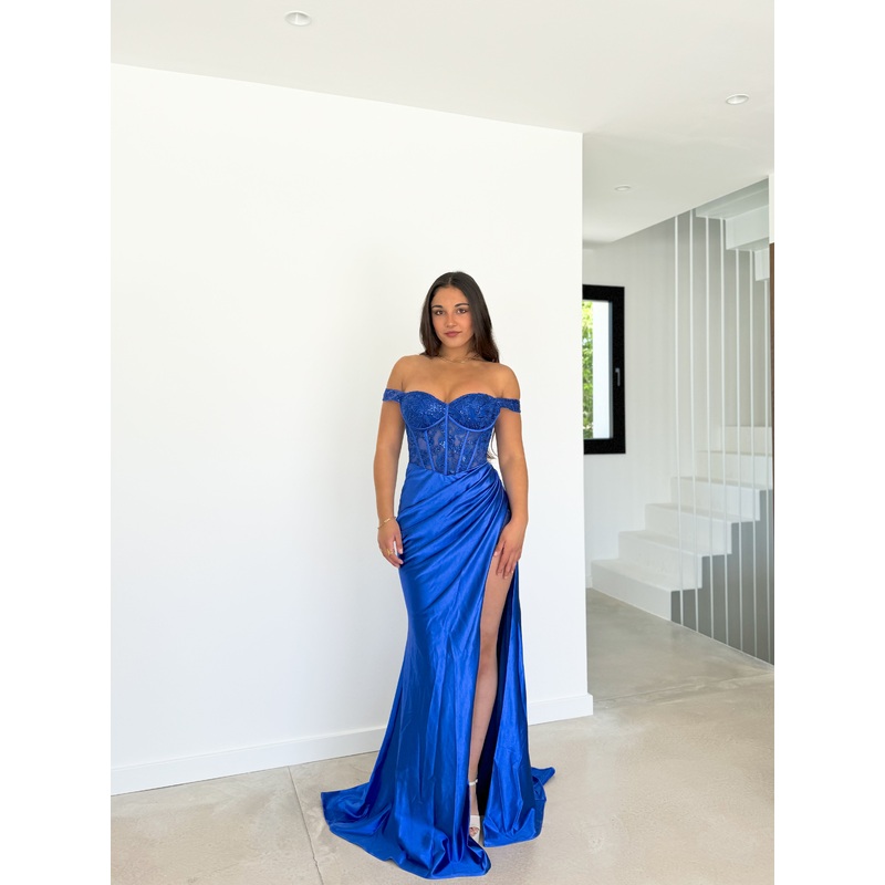 Vestido largo de tejido raso y escote palabra de honor, cuerpo tipo cors con ballenas detalle de manguitos en los brazos. Detalle de abertura en la falda en diseo drapeado. Cierre con cremallera invisibleVestido largo para graduaciones, bodas y eventos.Tal