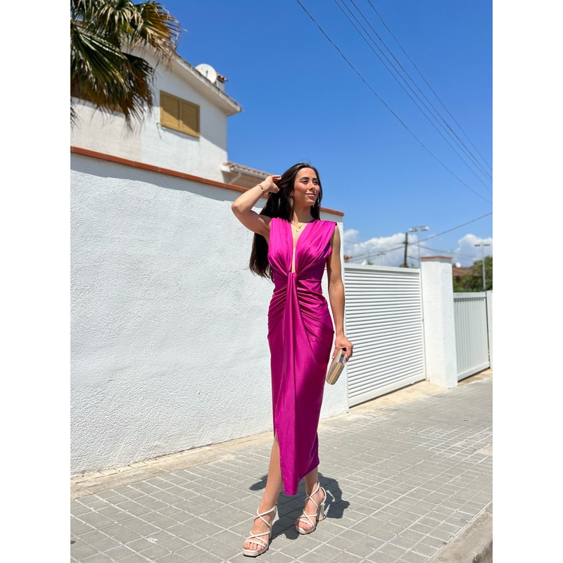 Vestido mindi ajustado de escote pico pronunciado con acabado anudado, sin manga y con hombreras. Abertura baja en el lateral de la falda. Es elstico.