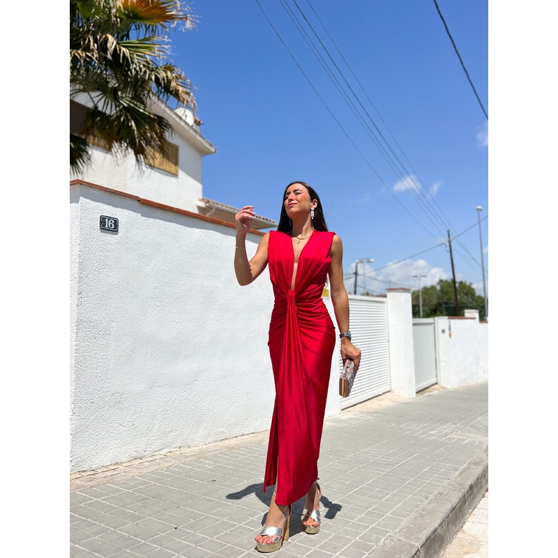 Vestido mindi ajustado de escote pico pronunciado con acabado anudado, sin manga y con hombreras. Abertura baja en el lateral de la falda. Es elstico.