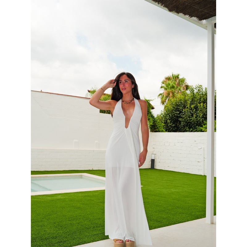 Vestido largo con escote pico pronunciado atado al cuello con detalle de banda. Tiene fruncido en el escote y forro.Talla nica (sirve de la 34 a la 38)Modelo: Altura 160 cm, Pecho 90 cm, Cintura 65 cm, Cadera 92 cm.Composicin: 95% polister y 5% elastanoEst