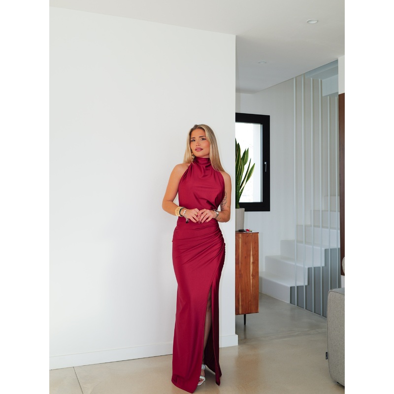 Vestido largo con escote halter atado al cuello con un lazo. Tiene detalle de abertura y fruncido en la falda.
