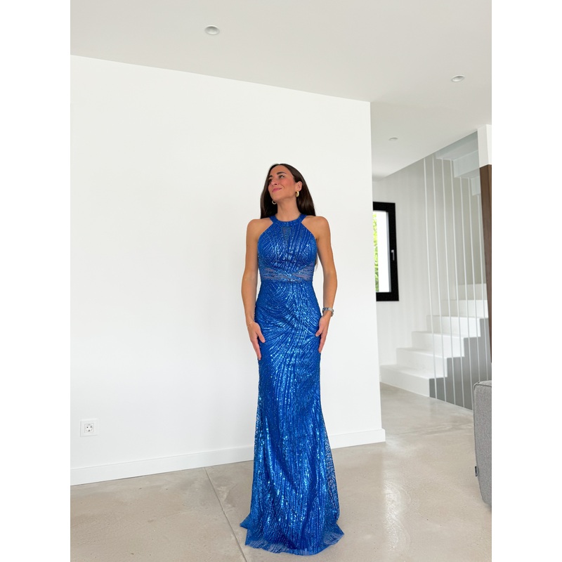 Vestido con corte sirena y escote halter cruzado con detalle de pedrera, brillos y transparencias. Espalda descubierta Lleva copas en el pecho y forro en la falda. Cierre con cremallera invisible.