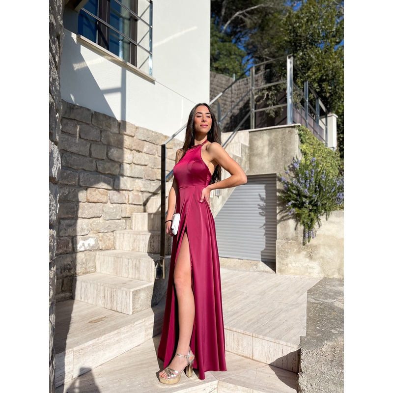 Vestido halter raso burdeos S (34-36)