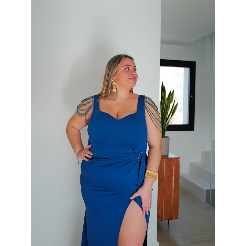 Vestido largo con escote corazn con tirantes. Tiene nudo en el lateral del abdomen y abertura en la pierna. Detalle de hombros con brillantes.Vestido largo para graduaciones, bodas y eventos.Talla XL(40/42), 2XL(42/44), 3XL(44/46) y 4XL(46/48)La modelo usa