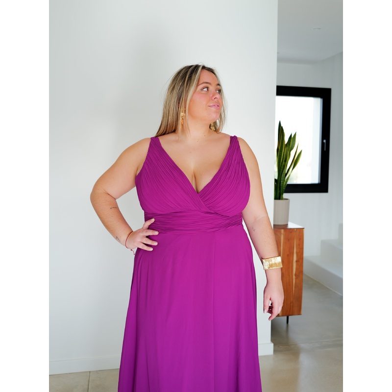 Vestido largo con escote pico. Detalle de drapeado en el escote y banda en la cintura. Tiene abertura en la pierna.Vestido largo para graduaciones, bodas y eventos.Tallas disponibles: XL(42/44), 2XL(44/46) y 3XL(46/48)La modelo usa la talla 3XLCOMPOSICIN: