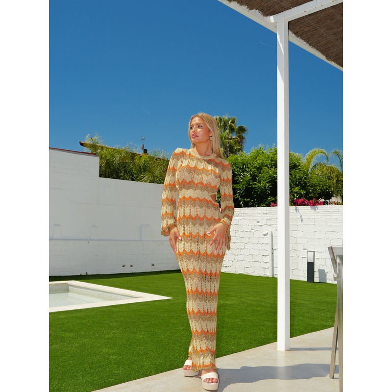 Vestido largo con estampado horizontal. Tiene mangas acampanadas y aberturas en la cintura. Detalle de tejido con hilos brillantes.