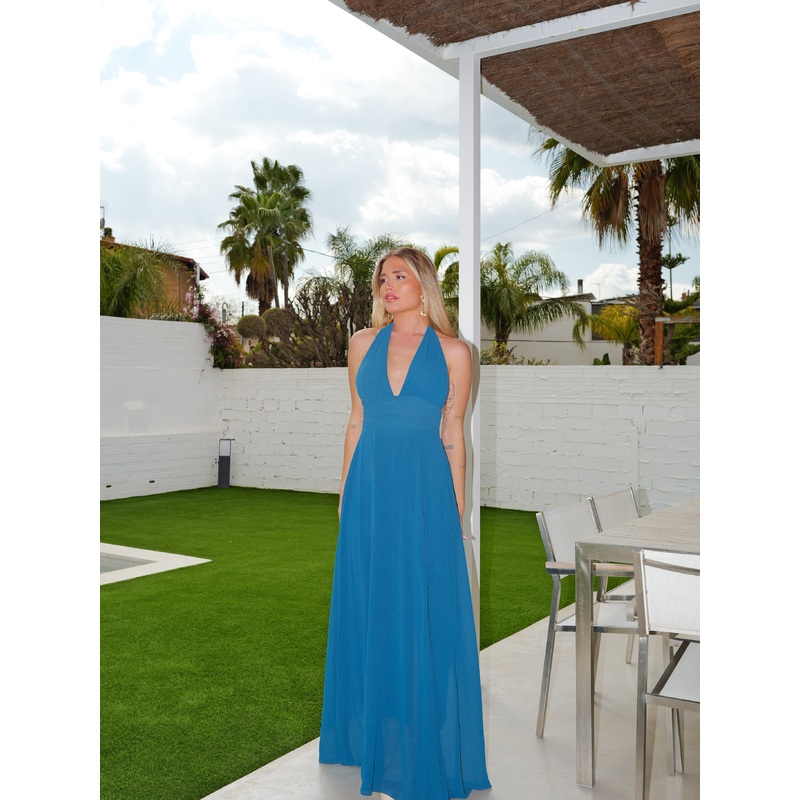 Vestido largo de tulle con escote pico pronunciado atado al cuello. Detalle de fruncido en el escote y banda en el abdomen atada a la espalda. Tiene abertura en la pierna.