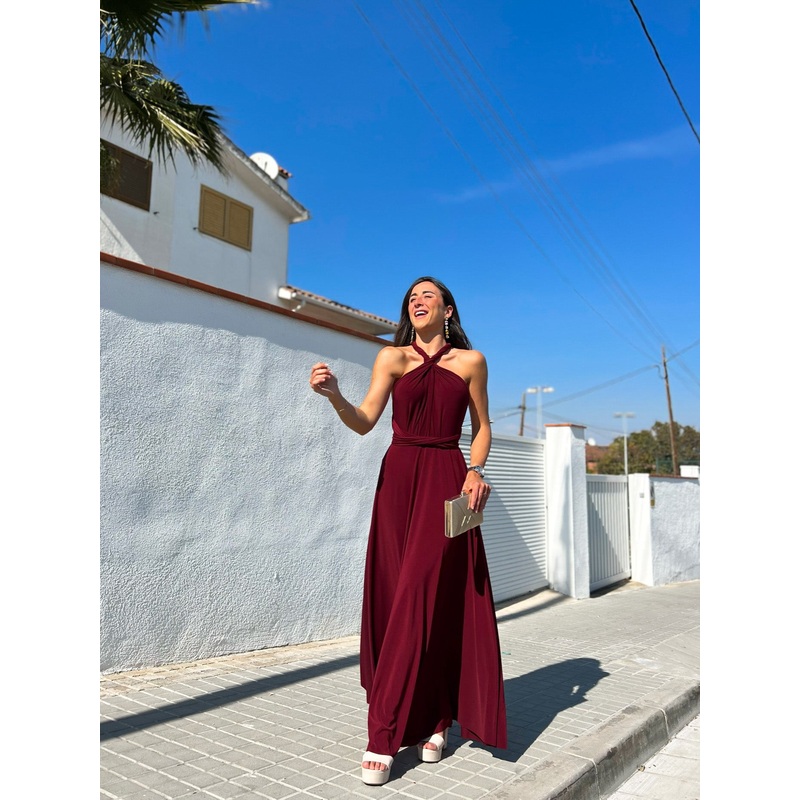 Vestido largo multiposicion. Falda ancha fluida, los tirantes se ajustan alrededor del contorno del cuerpo con la posibilidad de ponerlo en varias posiciones. Cintura elsticaVestido largo para graduaciones, bodas y eventosTalla nica (sirve de la 32 a la 40