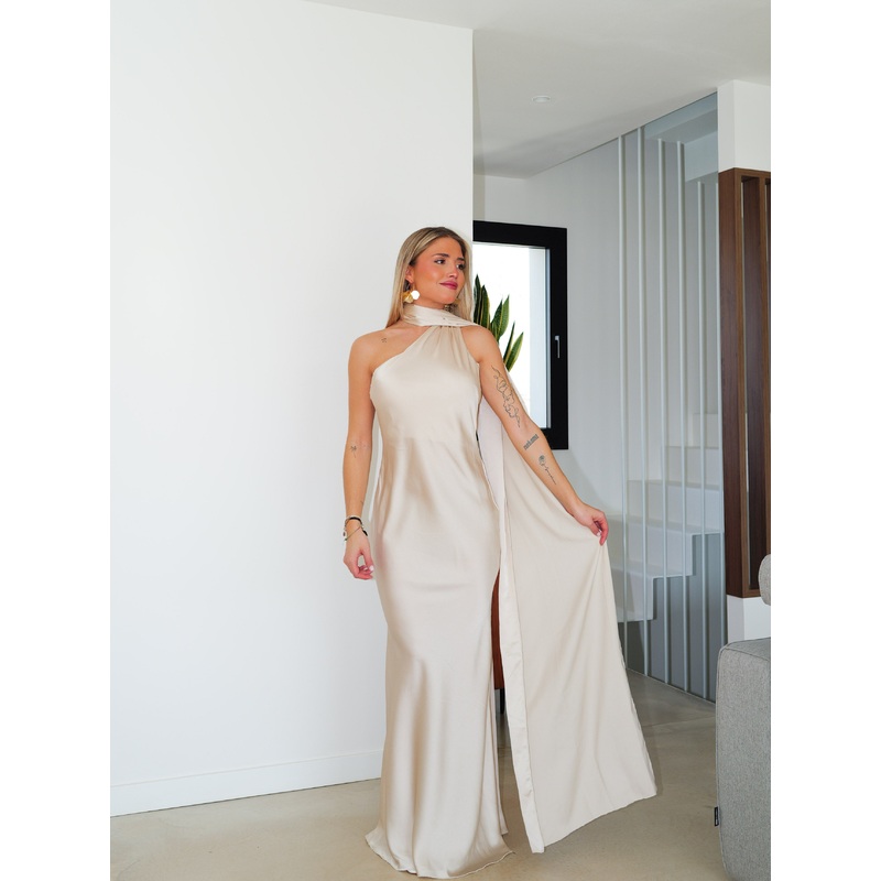 Vestido largo raso choker beige U(34-38)