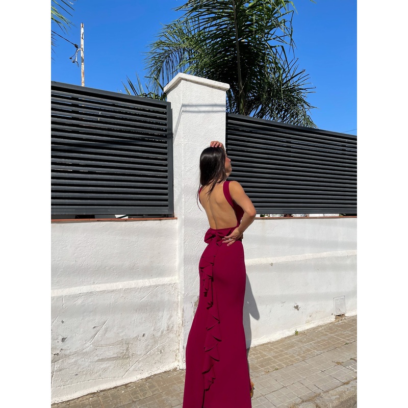 Vestido largo ajustado cola de sirena. Cuello barco, escote en la espalda y detalle lazo con volantes. Es elstico.Lleva copas en el pecho