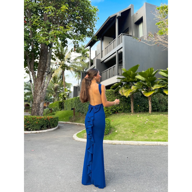 Vestido largo ajustado cola de sirena. Cuello barco, escote en la espalda y detalle lazo con volantes. Es elstico.Lleva copas en el pecho
