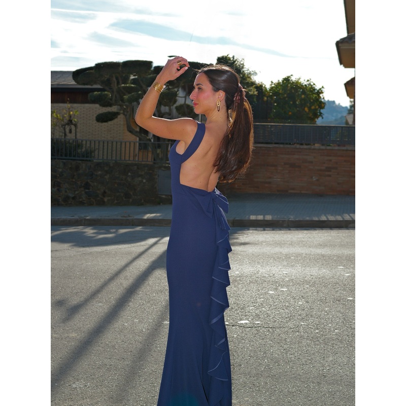Vestido largo ajustado cola de sirena. Cuello redondo y espalda descubierta con detalle de lazo con volantes. Es elstico. Lleva copas en el pecho.