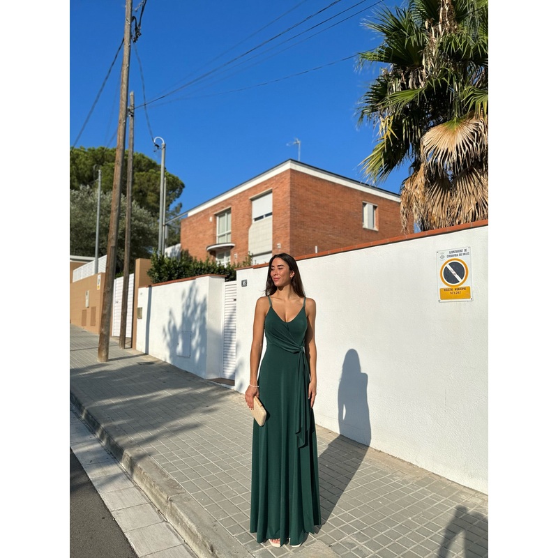 Vestido largo elastic. Escote en forma de pico por delante y por detrs. Escote cruzado. Ajustado en la cintura con lazo. Lleva copas en el pechoDisponible en botella, fucsia, lila, vino, azul klein, azul, turquesa y petrleoTalla nica (sirve de la 34 a la 4