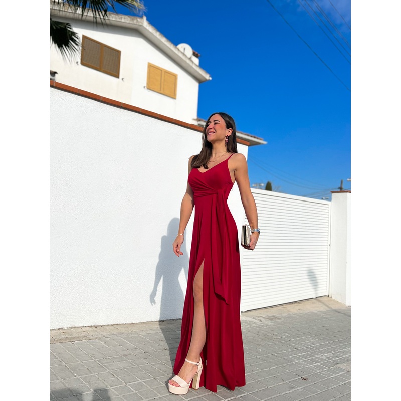 Vestido largo elstico . Escote en forma de pico por delante y por detrs. Escote cruzado. Ajustado en la cintura con lazo. Lleva copas en el pecho