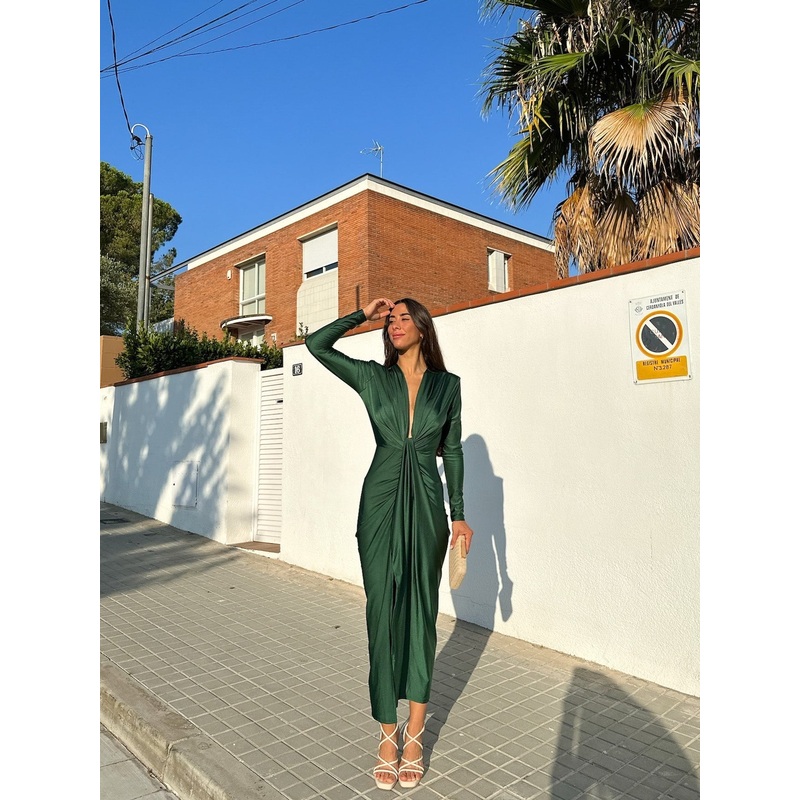 Vestido largo ajustado de escote pico pronunciado con acabado anudado, manga larga. Abertura baja en el centro de la falda. Es elstico.