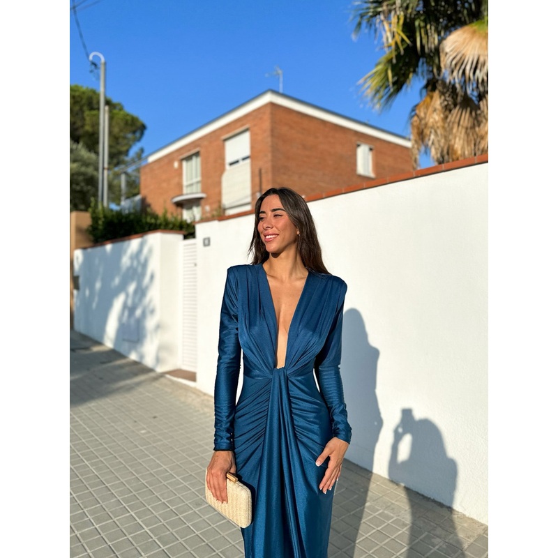 Vestido largo ajustado de escote pico pronunciado con acabado anudado, manga larga. Abertura baja en el centro de la falda. Es elstico.