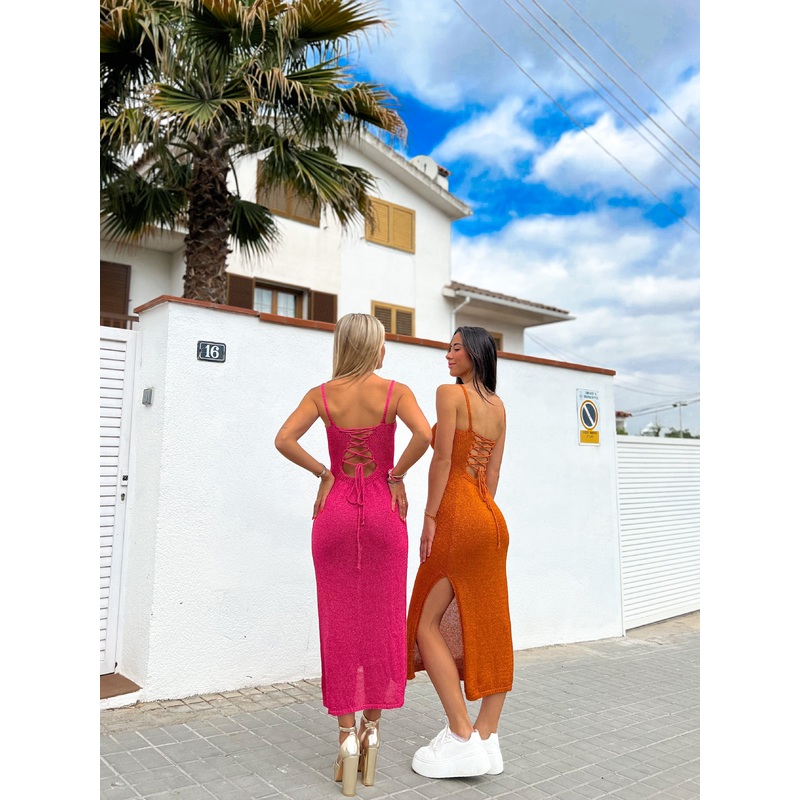 Vestido tirantes fino, de punto y dorado. Hilos con brillo. Detalle entrelazsdo en la espalda para ajustar. Espalda descubierta.