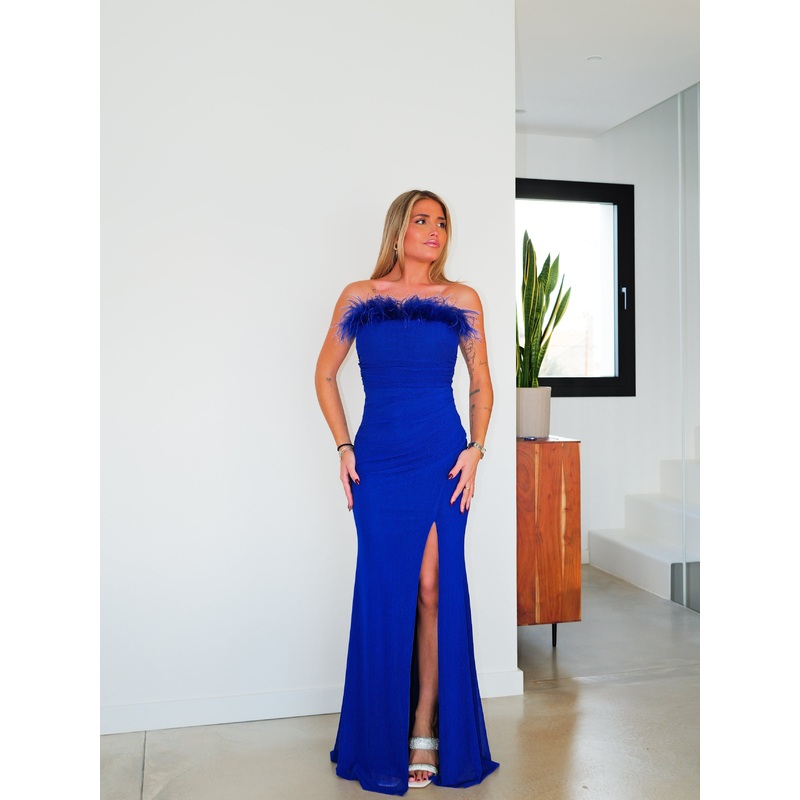 Vestido ajustado, largo y elstico con abertura lateral y plumas en el escote. Tiene forro interior y drapeado. Copas en el pechoVestido largo para graduaciones, bodas y eventos.Tallas disponibles: S (34/36) y M (36/38).Modelo: Altura 171cm, Pecho 90 cm, Ci