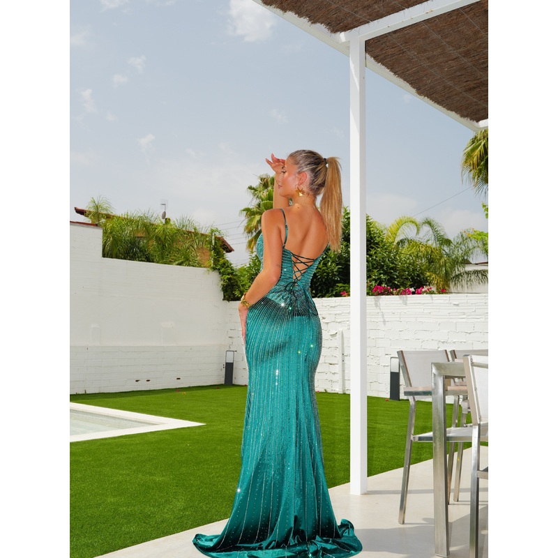 Vestido largo con escote pico con transparencias y tirantes. Tiene abertura en la falda y detalle de espalda entrelazada para ajustar al cuerpo. Tejido con pedrera por todo el vestido.Vestido largo para graduaciones, bodas y eventos.Talla S (34-36), M (36-