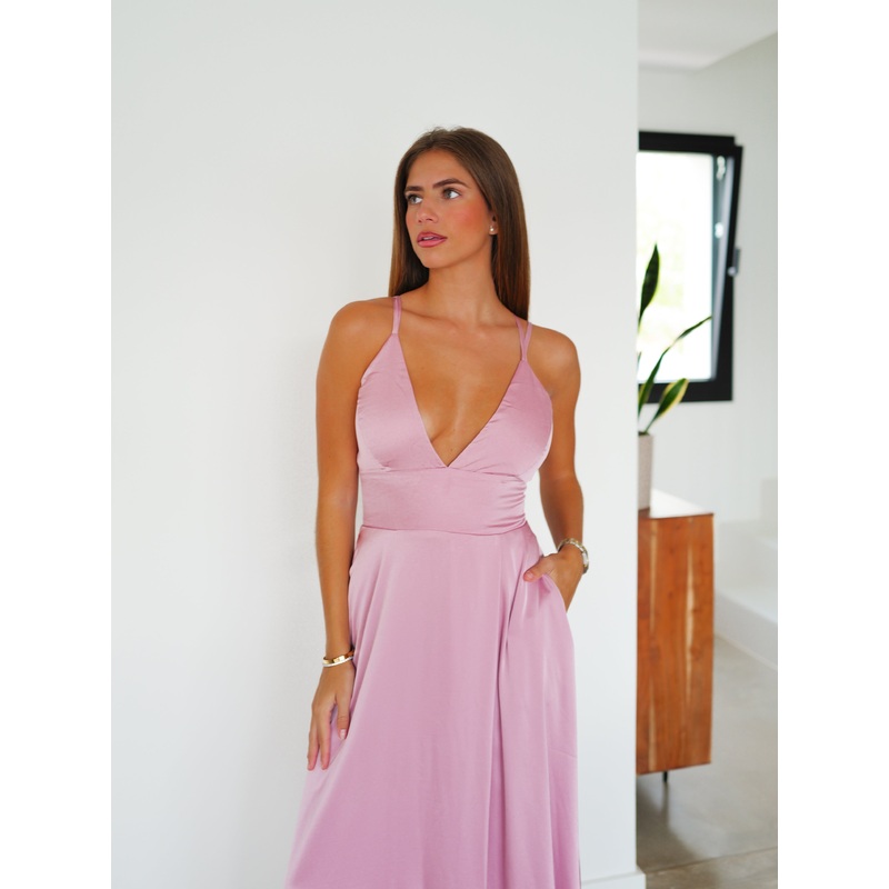 Vestido largo de tejido raso, con escote pico y banda en la cintura. Tirantes regulables con lazada en la espalda. Detalle de entrelazado cruzado. Cierre con cremallera invisible. Detalle de abertura en la falda