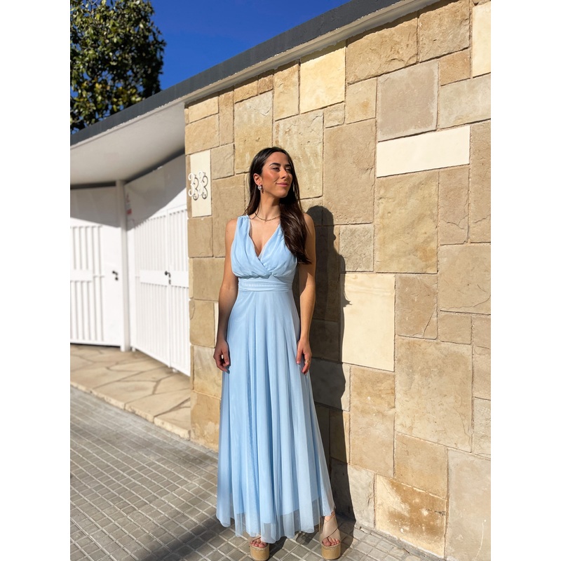 Vestido largo de tulle. Escote en forma de pico por delante y por detrs. Escote cruzado. Ajustado en la cintura con lazo. Llevo cocos en el pechoVestido largo para graduaciones, bodas y eventosTalla nica ( sirve de la 32 a la 42)Modelo: Altura 171 cm, Pech