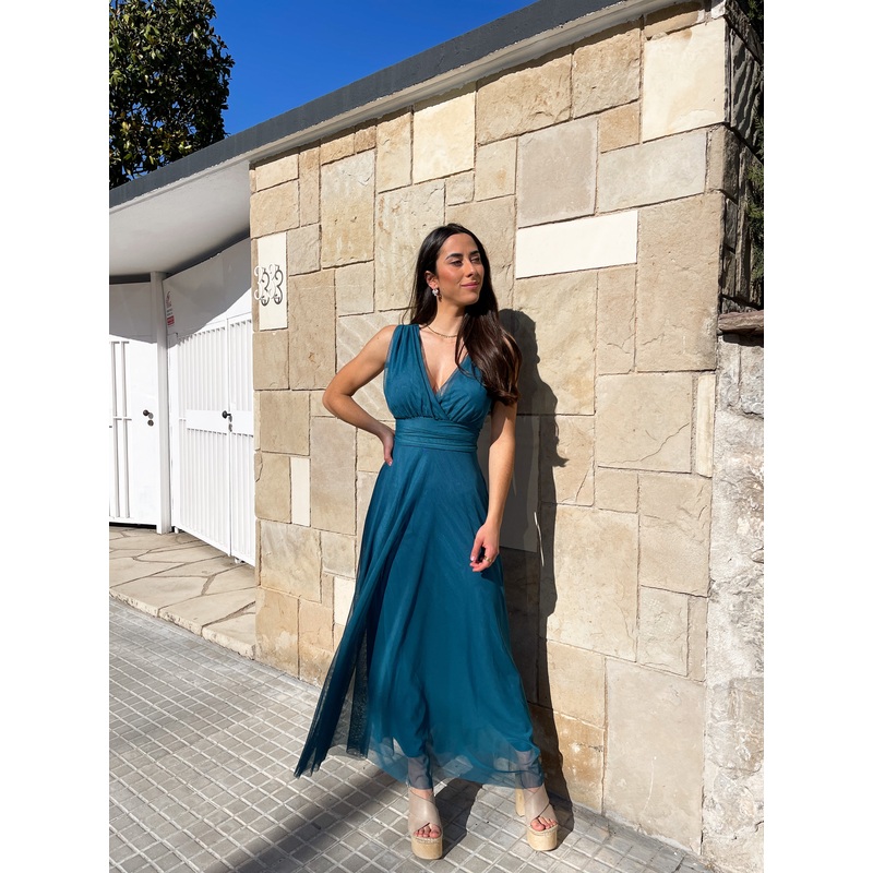 Vestido largo de tulle. Escote en forma de pico por delante y por detrs. Escote cruzado. Ajustado en la cintura con lazo. Llevo cocos en el pechoVestido largo para graduaciones, bodas y eventosTalla nica ( sirve de la 32 a la 42)Modelo: Altura 171 cm, Pech
