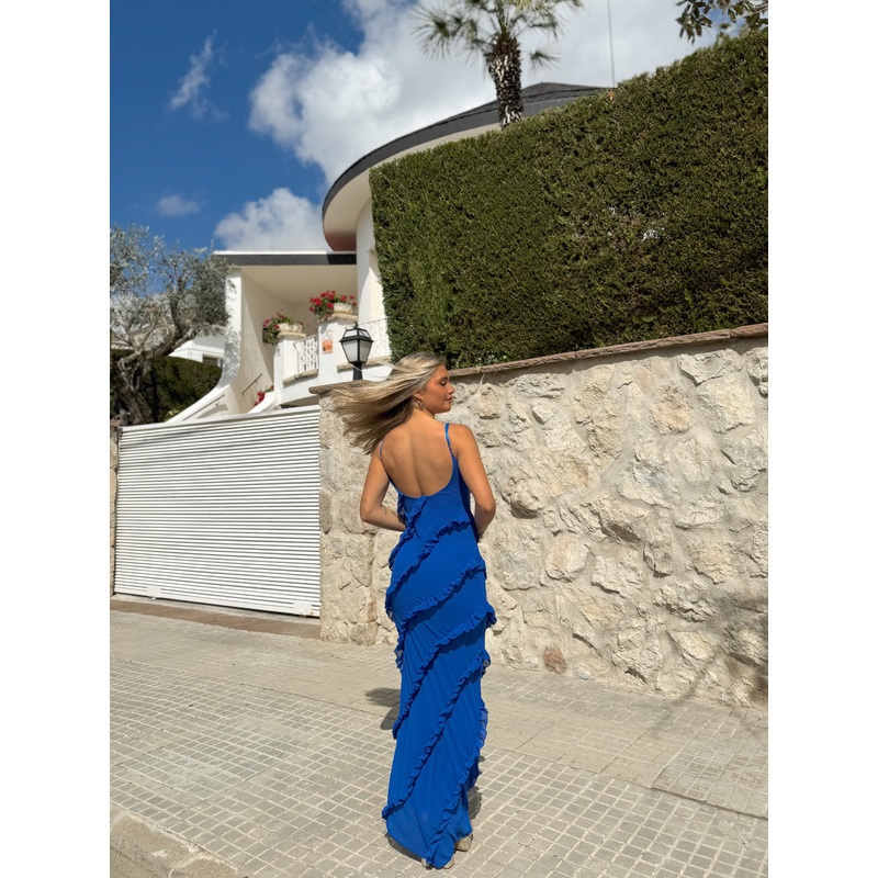 Vestido largo de tejido crepe con escote pico y tirantes finos regulable. Espalda al aire con escote pico, cuerpo tipo sirena. Tiene forro.