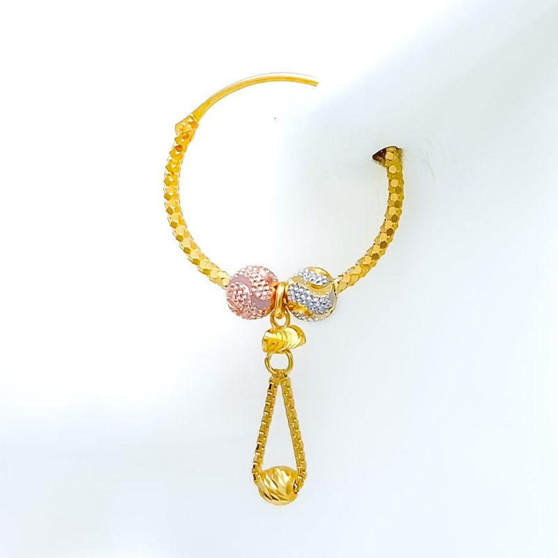 These stunning 22k gold hoop earrings, weighing 4.1 grams, feature a vibrant combination of yellow, white, and rose gold finishes. Each earring measures 0.75 inches in diameter and 1.5 inches in length, offering a delightful blend of elegance and color. Ideal for those who appreciate lively and sophisticated jewelry, these Bali-style hoop earrings combine the timeless beauty of gold with a contemporary tri-color design, making them a perfect choice for any special occasion or stylish everyday wear.