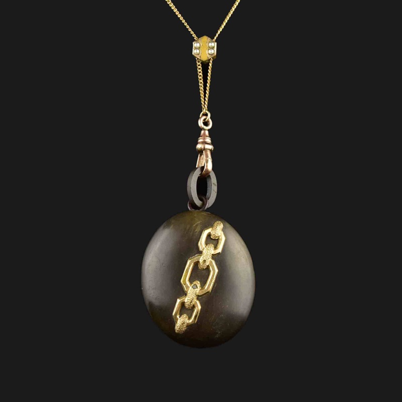 Victorian 10K Gold Gutta Percha Locket Muff Guard Necklace
