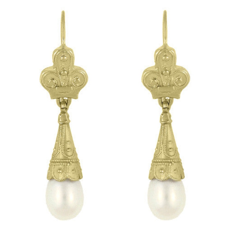 Victorian Fleur de Lys Pearl Drop Earrings in 14 Karat Yellow Gold