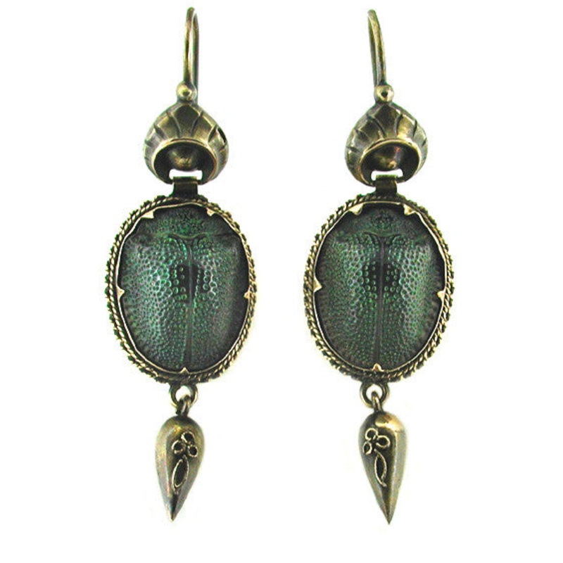 These unusual antique Victorian drop earrings circa 1870's are actually bezel set with the backs of real Egyptian scarab beetles! Scarabs were regarded by the ancient Egyptians as a symbol of resurrection and immortality and became a subject of fascination