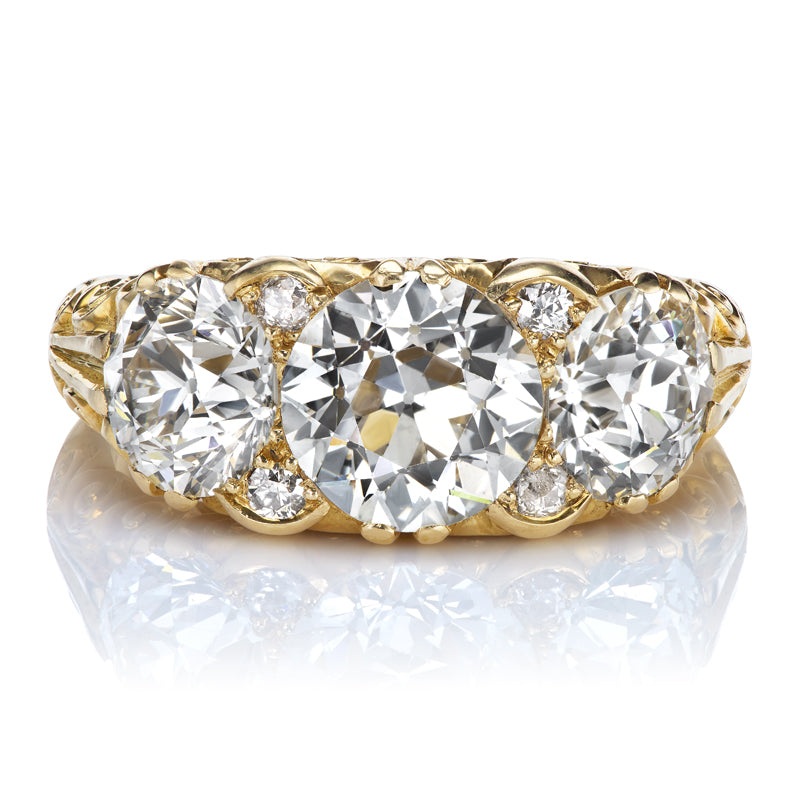 The Vienna ring is an authentic antique diamond ring from the Victorian Era circa 1890. The ring centers an Old European Cut diamond of approximately 2.00 carats, H-I color, VS-SI clarity. Set to each side of the center stone is an Old European Cut diamond, each approximately 1.30 carats of H-I color, VS-SI clarity. Four small Old European Cut diamonds are set in between these 3 stones. The stones are set in an 18kt Yellow Gold setting with beautifully carved hand-engravings. The ring is currently size 7.5 and can be resized!