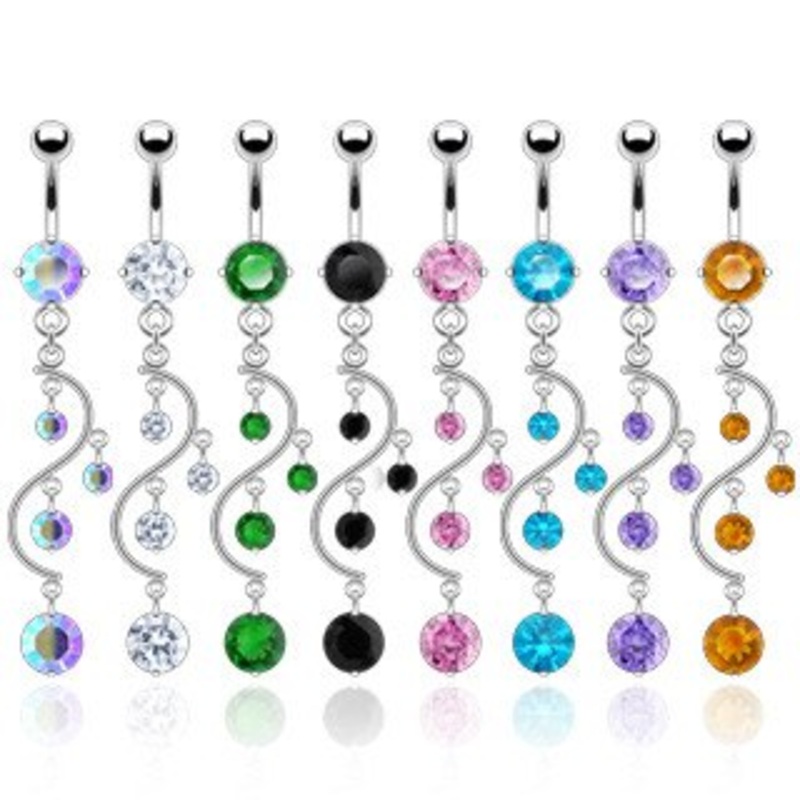 The 14 gauge vine cz belly dangle is made from 316L stainless steel with external threading. Only the 5mm ball end is removable. Choose your gem color below.