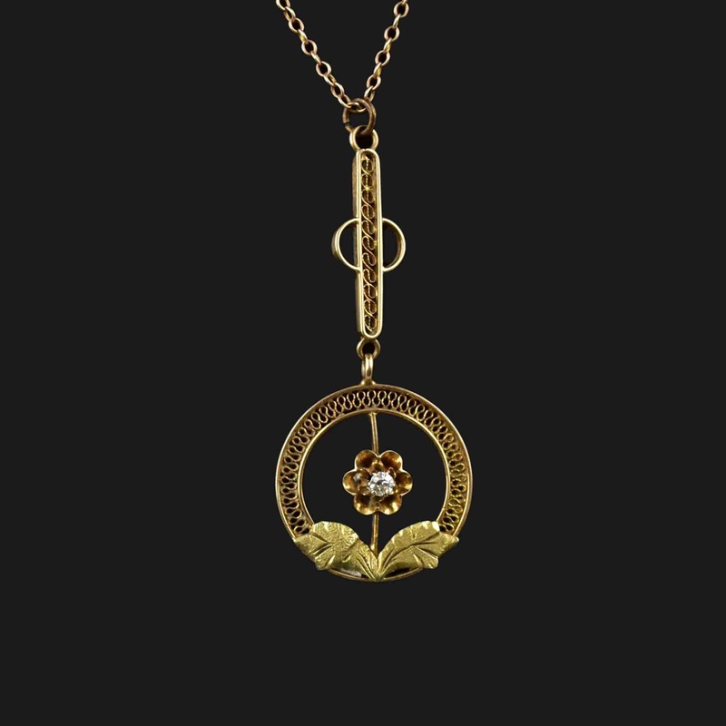 Gorgeous Vintage 10K gold lavaliere necklace! This stunning item features a central diamond in a delicate buttercup setting, with intricately designed gold leaves positioned just below and a beautifully crafted gold filigree frame enveloping it all. Incred