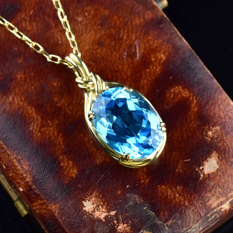 Behold this exquisite vintage pendant, boasting a captivating 12 carat blue topaz gem. The large faceted stone glows radiantly in any light, suspended gracefully within an elegant 10 karat gold rope and knot mounting. A stunning piece that will leave onloo