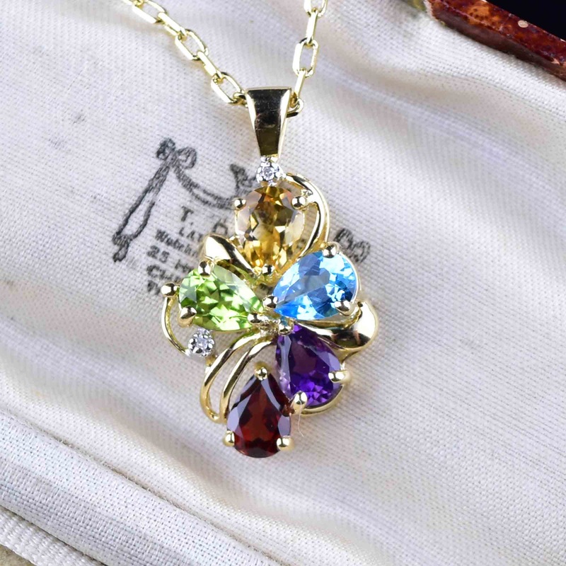 This exquisite 10K gold pendant necklace has been crafted with an eye for vintage finesse. A rainbow of peridot, topaz, amethyst, citrine and garnet stones, all pear cut and open backed, lends the piece an incredible spectrum of hues. The extra spark of a dainty diamond at the top serves to drastically elevate this beautiful pendant, making it the ideal accessory for adding a touch of vibrancy to any ensemble.