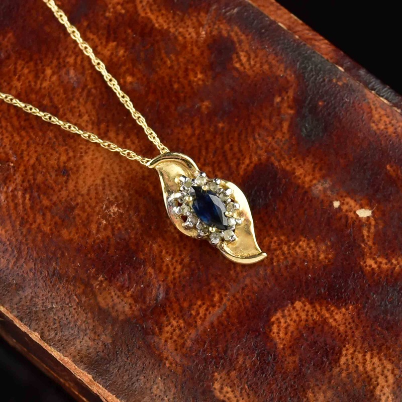 Vintage 10K Gold Sapphire Diamond Halo Pendant Necklace